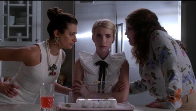 Denise follows her, asking for payment for the job she is done to Kappa House (though in reality, she did nothing), to which Chanel continues to walk, looking over her shoulder and telling Denise to call her family’s money managers, before going downstairs, with the Chanels and Denise still following. Suddenly, Chanel comes to a halt, claiming that there is a horrible burning smell coming from the dining room. They all rush downstairs towards it, only to find Jennifer’s corpse covered in candle wax, which makes them all scream in horror.