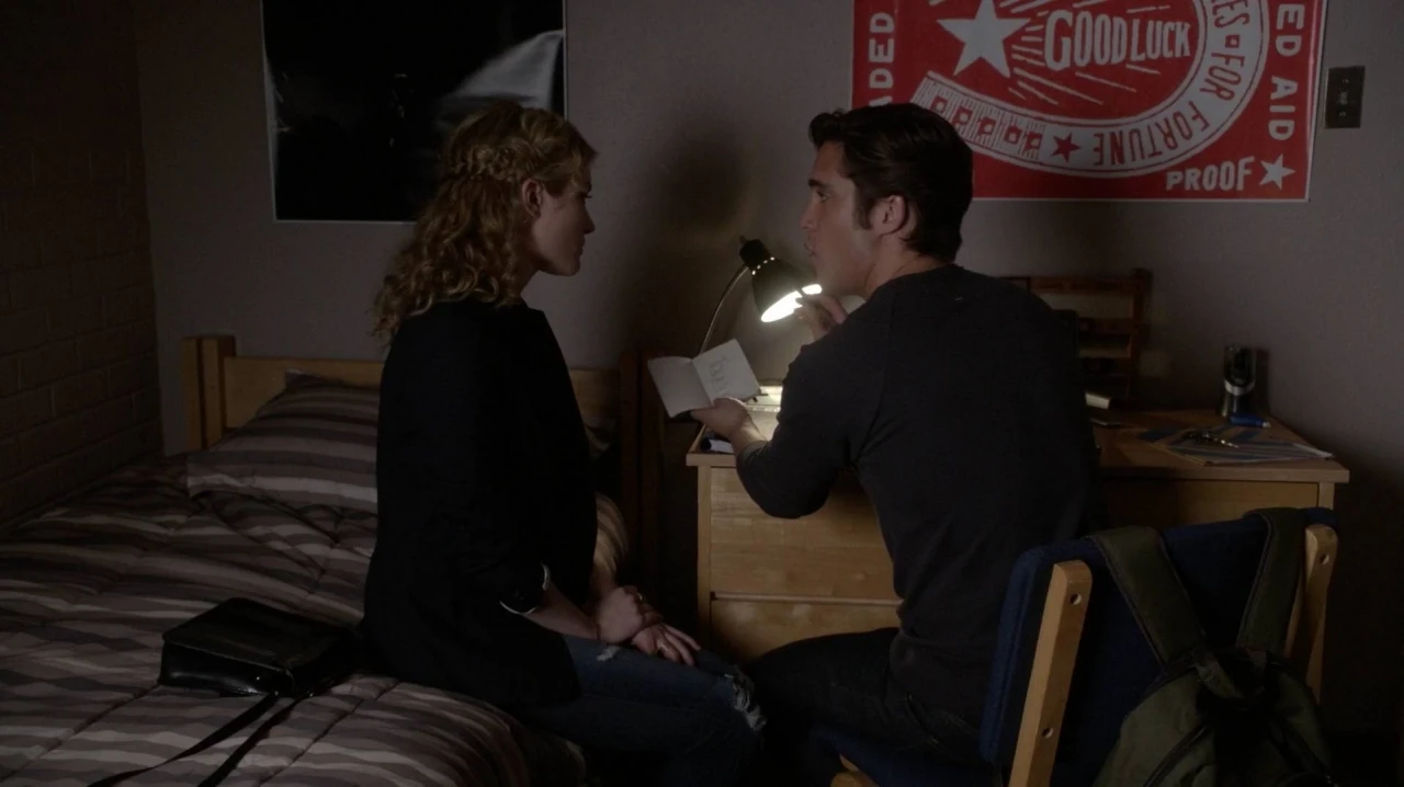 They start kissing passionately but Grace stops him, saying that they can't kiss if there is a killer in the campus of Wallace University. They both agree that she will break into that secret door at Kappa house and he will break into