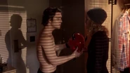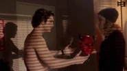 When Pete is attacked by the Red Devil after finding names linked to Kappa's past, he meets up with Grace in his dormitory. Grace tells him about the Kappa legend and he, shirtless, shows her the names that he wrote on the sheet. Grace opens the closet to give him something to put on, but discovers the Red Devil costume, which happens to be the mascot of the university. Grace freaks out and asks Pete about his age, he answers that he will turn 20 in a month. Scares, Grace leaves the room because that is the exact same year that the baby would have, and thinks that Pete might be the killer.